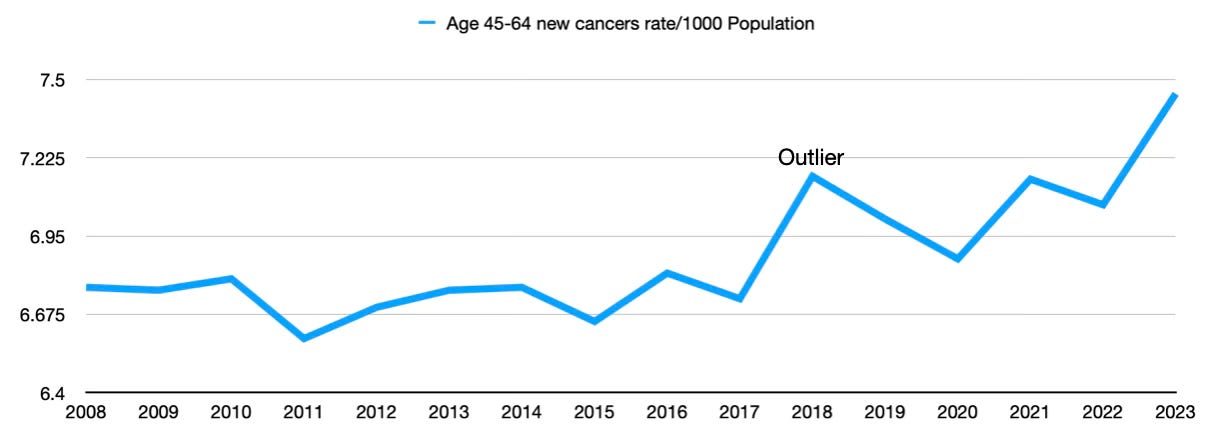 Cancer rates among 45-64 year olds rose by 8% in 2023 compared to the 2015-2019 average.