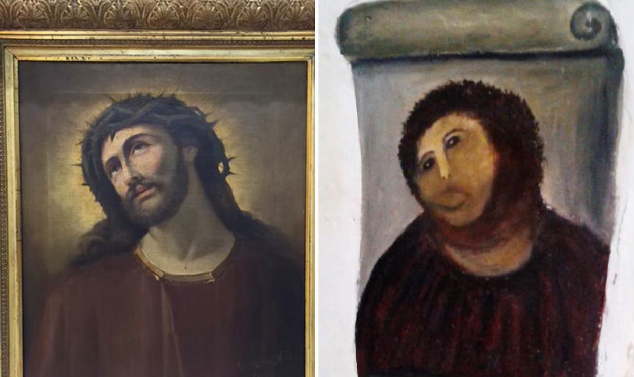 Patching up genetic systems through gene therapies, gene editing, immune adjusting vaccines, etc. may damage the overall synchrony supporting the higher expressions of human enlightenment. In other words gene therapies may keep a system going but render it deficient. In 2012 a devout parishioner in Spain noticed that the condition of a fresco on the wall of her church had deteriorated. She was not a painter, but with good intentions she set about restoring it herself. The result was still recognisable as a face, but sadly it was no longer a masterpiece:)