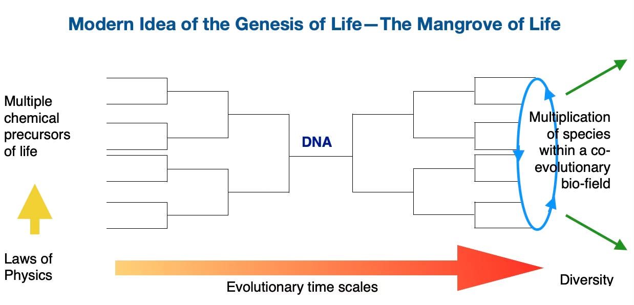 In essence, a great many improbable factors are imagined to come together to almost accidentally produce the highly integrated and complex genetic system which underpins all types of living organisms. This is often referred to as the mangrove of life because the genesis of DNA is supposed to have many chemical precursors or roots. This type of understanding is so deeply rooted in scientific mythology that its probability is rarely questioned.